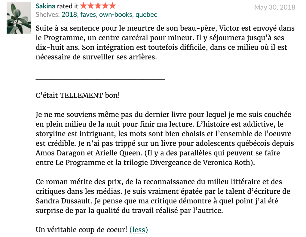 Nous pouvons également offrir à la communauté Goodreads un commentaire pour leur donner notre opinion globale du titre lu.